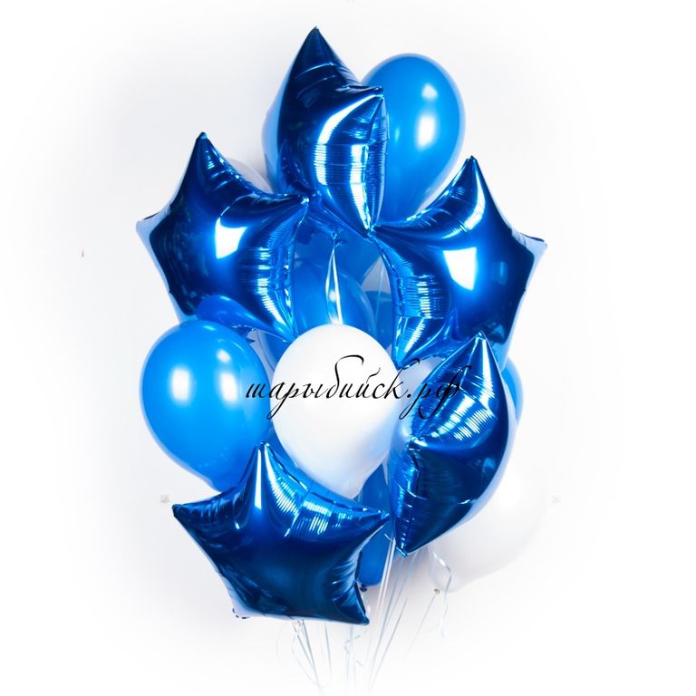 Облако бело-синих шариков с синими звездами 3750 руб. В корзину Состав композиции : 5 фольгированных синих звезд высотой – 45 см 15 латексных белых и синих шариков высотой – 30 см Состав композиции : 5 фольгированных синих звезд высотой – 45 см 15 латексных белых и синих шариков высотой – 30 см
